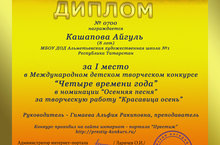 Ученица МБОУ ДОД "АДХШ №1" города Альметьевска, РТ Кашапова Айгуль заняла I место в Международном детском творческом конкурсе "Четыре времени года" в номинации "Осенняя песня" за творческую работу "Красавица осень"