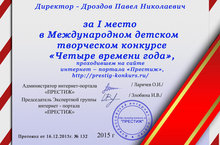 За I место в Международном детском творческом конкурсе "Четыре времени года" проходившем на сайте интернет-портала "Престиж" благодарственным письмом был отмечен директор ДХШ №1 Дроздов Павел Николаевич