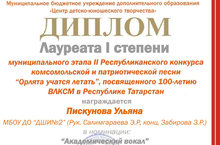 Учащиеся класса преподавателя Салимгараевой Э.Р. и концертмейстера Забировой З.Р. приняли участие в Муниципальном этапе Республиканского конкурса комсомольской и патриотической песни "Орлята учатся летать", посвященного 100-летию ВЛКСМ в Республике Татарстан. Поздравляем их с победой! Желаем успехов на Республиканском конкурсе.