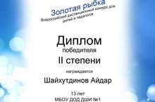 09.02.17. На Всероссийском дистанционном конкурсе для детей и педагогов "Золотая рыбка" (г. Ростов-на-Дону) Шайхутдинов Айдар (преподаватель Исхакова Л.А.) получил Диплом победителя II степени. Поздравляем!