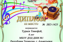 18.01.2017. На Всероссийском творческом конкурсе для детей и педагогов "Лира" (г. Ростов-на-Дону) в номинации "Инструментальное исполнительство" Тураев Тимофей (преподаватель Исхакова Л.А.) получил III место. Поздравляем!