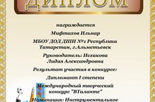 19.01.2017. На Международном творческом конкурсе "ВТаланте" (г.Красноярск) Мифтахов Ильнар (преп. Исхакова Л.А.) получил звание Дипломанта I степени. Поздравляем!