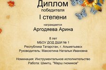 02.11.2016. На Всероссийском дистанционном конкурсе для детей и педагогов "Золотая рыбка" (г.Кемерово) в номинации "Инструментальное исполнительство" Аргодяева Арина получила Диплом победителя I степени (преподаватель Максютина Н.И.). Поздравляем с победой и желаем дальнейших творческих успехов!
