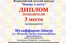 На Всероссийском детском конкурсе "Поверь в мечту" (г.Трёхгорный Челябинской области), в номинации: "Инструментальное исполнительство" Мугаффаров Айнур (преподаватель Исхакова Л.А.) получил Диплом победителя (3 место). Поздравляем!