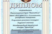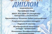 06.04.2016. На Международном творческом конкурсе "Артталант" (г.Красноярск), в номинации: "Инструментальное исполнительство" Мугаффаров Айнур (преподаватель Исхакова Л.А.) стал Лауреатом IV степени. Поздравляем!