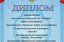23.03.2016. На Международном творческом конкурсе "В Творчестве" ( г. Красноярск), в номинации "Музыкальное исполнительство" Ансамбль аккордеонистов "Сюрприз" (преподаватель Исхакова Л.А.) получил I Место! Поздравляем!