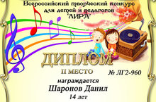 26.03.2016. На Всероссийском творческом конкурсе для детей и педагогов "Лира" (г. Ростов-наДону) в номинации "Музыкальное исполнительство" учащийся нашей школы Шаронов Данил (преподаватель Муравьева Т.С.) занял II Место. Поздравляем и желаем дальнейших творческих успехов!