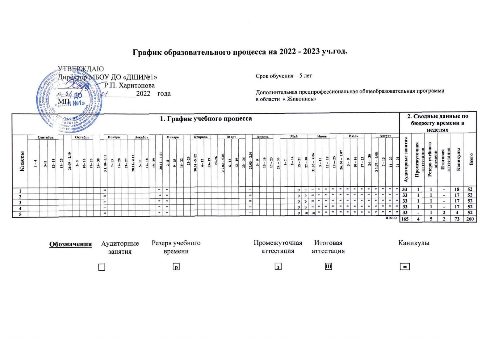 - График образовательного процесса ДПОП "Живопись" срок обучения 5 лет. на 2022-2023 уч. год