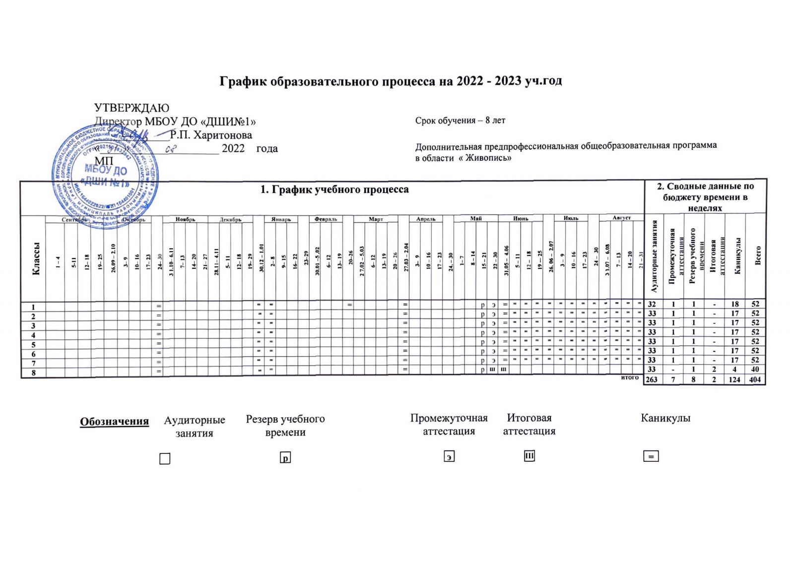 - График образовательного процесса ДПОП "Живопись" срок обучения 8 лет. на 2022-2023 уч. год