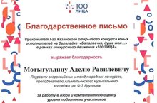 Преподаватель колледжа Мотыгуллин Адель Равилевич был награжден благодарственным письмом оргкомитета I-го Казанского открытого конкурса юных исполнителей на балалайке «Балалаечка, душа моя…» в рамках конкурсного движения «100/ЛИЦА» за работу в жюри и компетентную оценку уровня подготовки участников.