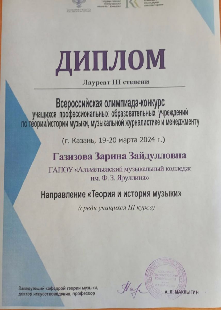 Газизова Зарина - Лауреат 3 степени по теории/истории музыки.