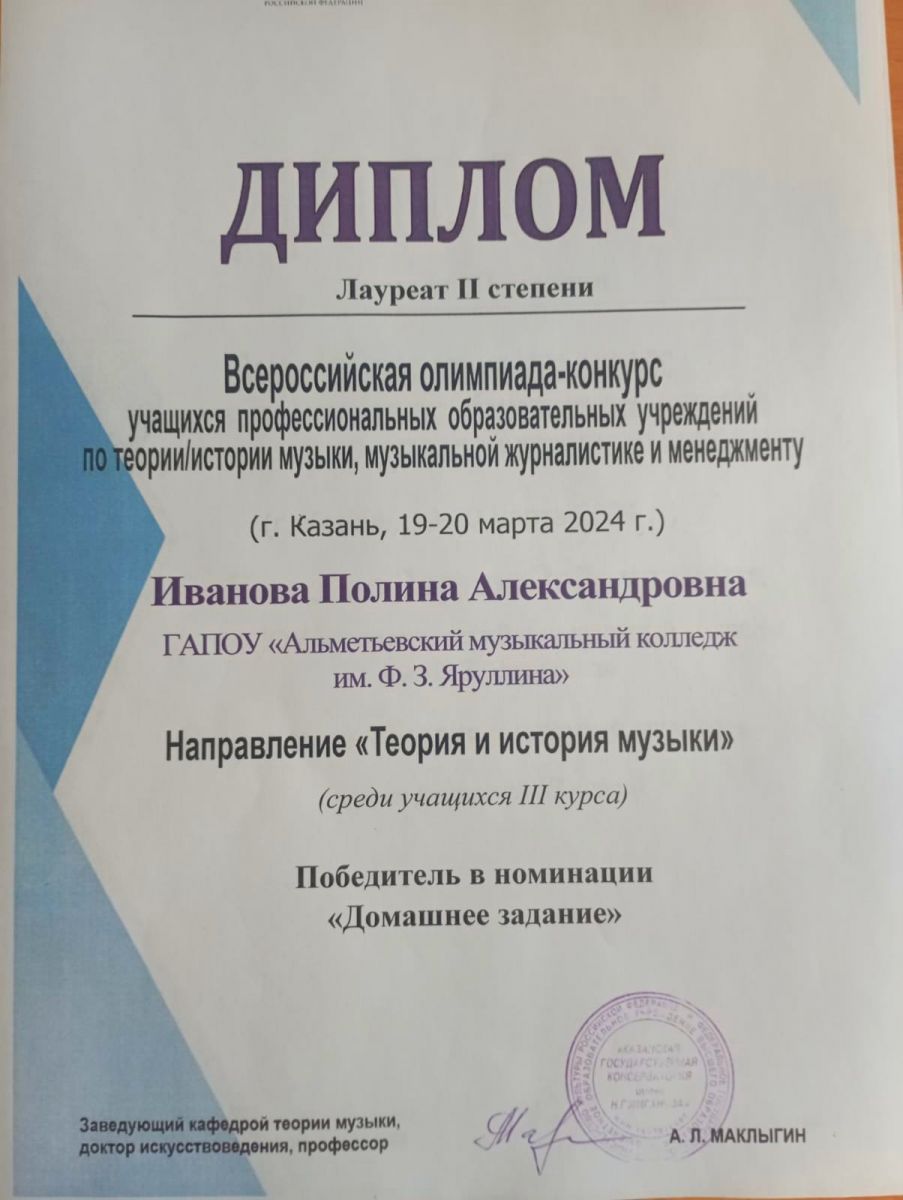 Иванова Полина - Лауреат 2 степени по теории/истории музыки и Победитель в номинации "Домашнее задание".