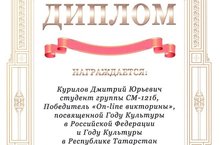 Курилова Дмитрия Юрьевича, студента группы СМ-121б, победителя "On-line викторины", посвященной Году Культуры в Российской Федерации и Году Культуры в Республике Татарстан.