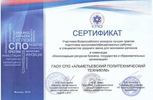 ПОЗДРАВЛЯЕМ коллектив ГАОУ СПО «Альметьевский политехнический техникум» с получением СЕРТИФИКАТА участника Всероссийского конкурса лучших практик подготовки Высококвалифицированных рабочих и специалистов среднего звена для экономики регионов в номинации «Консолидация ресурсов бизнеса, государства и образовательных организаций»