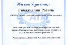 Гибадуллин Разиль (11СТО) награжден дипломом участника регионального конкурса авторской песни "Студенческие аккорды" среди ССУЗ юго-восточного региона. Руокводитель Липатова А.М.