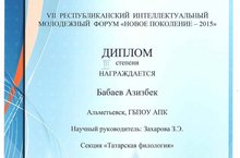 Бабаев Азизбек (21 СТМ) награжден дипломом 3 степени за участие в VII Республиканском интеллектуальном молодежном форуме "Новое поколение - 2015" в секции "Татарская филология". Научный руководитель - Захарова З.Э.