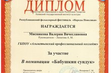 Мясникова Валерия (11 НПК) награждена дипломом участника в номинации "Бабушкин сундук". Руокводитель - Липатова А.М.