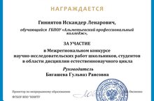 Обучающийся группы 21 СТМ Гиниятов И. награжден дипломом за участие в Межрегиональном конкурсе научно-практических работ школьников, студентов в области дисциплин естественно-научного цикла (руководитель Бигашева Г.Р.)