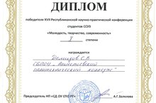 8 апреля в ГАПОУ "Лениногорский политехнический колледж" прошла ежегодная Республиканская научно-практическая конференция СПО РТ "Молодость, творчество, совеременность". Студенты нашего колледжа Зарипов О. (21 НС) (руководитель Хисамутдинова С.Э.) и Демидов С. (31 СТО) (руководитель Чекова Л.Д.) приняли участие в работе конференции. Демидов получил диплом 1 степени.