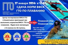 Центр тестирования ВФСК ГТО г.Альметьевск приглашает вас 27 января 2024 года в 11.00 выполнить норматив ВФСК ГТО по плаванию в МАОУ "Адымнар-Альметьевск" (Галеева 20).
