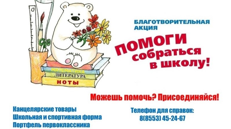 Благотворительная акция «Помоги собраться в школу!» - это возможность для нуждающихся детей получить полный комплект школьных принадлежностей. В составе комплекта школьного портфеля традиционного будут канцтовары, тетради, набор для уроков труда и изобразительного искусства.