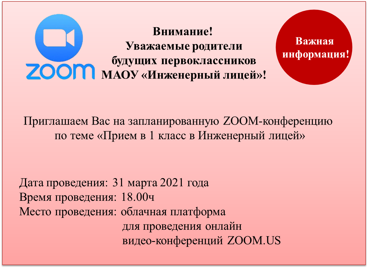 Приглашаем Вас на запланированную ZOOM-конференцию по теме «Прием в 1 класс в Инженерный лицей».