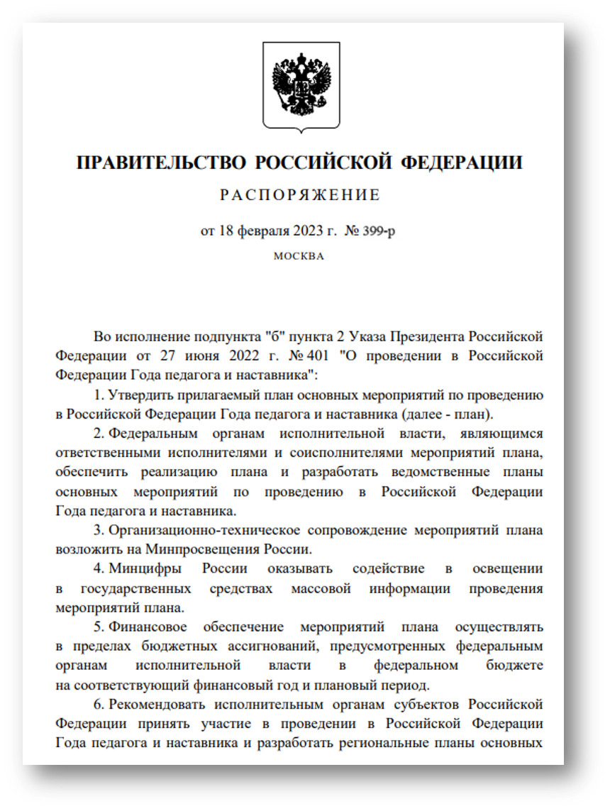 Распоряжение Правительства РФ от 18.02.2022 № 399-р «Об утверждении плана основных мероприятий по проведению в Российской Федерации Года педагога и наставника
