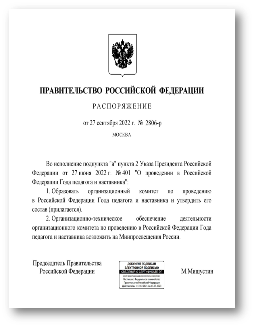 Распоряжение Правительства РФ от 27.09.2022 № 2806-р «Об утверждении состава организационного комитета по проведению в Российской Федерации Года педагога и наставника»