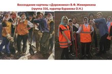 В творческой работе группы воссоздан сюжет картины «Дорожники» В.Ф.Жемерикина.