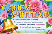 Дорогие наши учителя! Поздравляем вас со Всемирным днем учителя! Высоко ценим щедрость ваших любящих сердец, ваше терпение и понимание, преданность делу и любовь к нам — своим ученикам! Желаем крепчайшего здоровья, бодрости тела и духа, радости от вашего нелегкого труда и всяческих удач в личной жизни! Пусть вас окружают уважение и любовь, доброжелательность и милосердие, жизнерадостность и наша благодарность! С уважением коллектив МБДОУ "ЦРР д/с №6 "Жар-птица"
