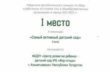 "Центр развития ребенка-детский сад N6 "Жар-птица" стали победителями 1 степени, собрав 500 килограммов отработанных батареек. 01.12.2023