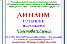Республиканский конкурс творческих работ «Рабочей профессией славится мой Татарстан!», посвященный 100-летию образования ТАССР», г. Казань 20.12.2019