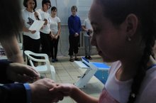 Учашиеся секции "Плавание" выполняют подводящие упражнения с доской "Кроль на груди" 25.02.2019