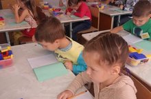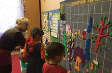 Знакомство с "Фиолетовым лесом". На занятии учащиеся учились ориентироваться в большом пространстве, развивать координацию, мелкую моторику и ловкость рук. Активизировали словарь за счет слов-терминов, обозначающих пространственные отношения и направления (прямо, влево, вправо) и точного названия цвета и формы объектов.
