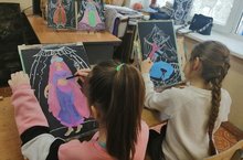 Обучающиеся объединения "Веселый карандаш" на открытом занятии знакомились с искусством иллюстрации книг, учились работать с кистью, подбору цветового решения на палитре в работе с красками.