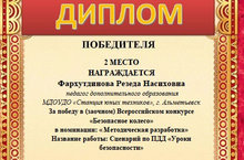 Поздравляем Фархутдинову Резеду Насиховну, педагога дополнительного образования за победу в заочном Всероссийском конкурсе «Безопасное колесо» 12.05.2020