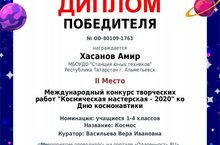 Поздравляем Хасанова Амира,обучающегося объединения "Юные кудесники" за победу в международном конкурсе творческих работ "Космическая мастерская-2020"