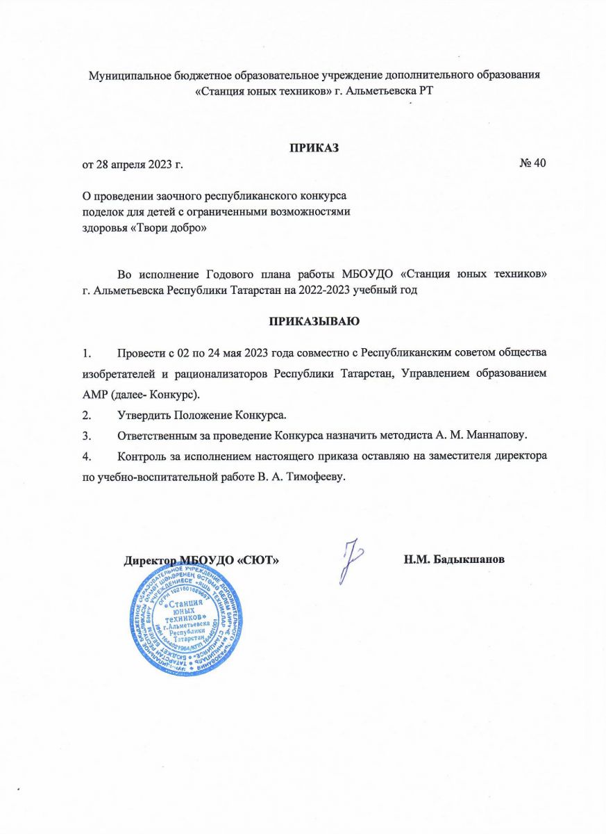 Приказ о проведение заочного республиканского конкурса поделок для детей с ограниченными возможностями здоровья «Мой яркий мир»