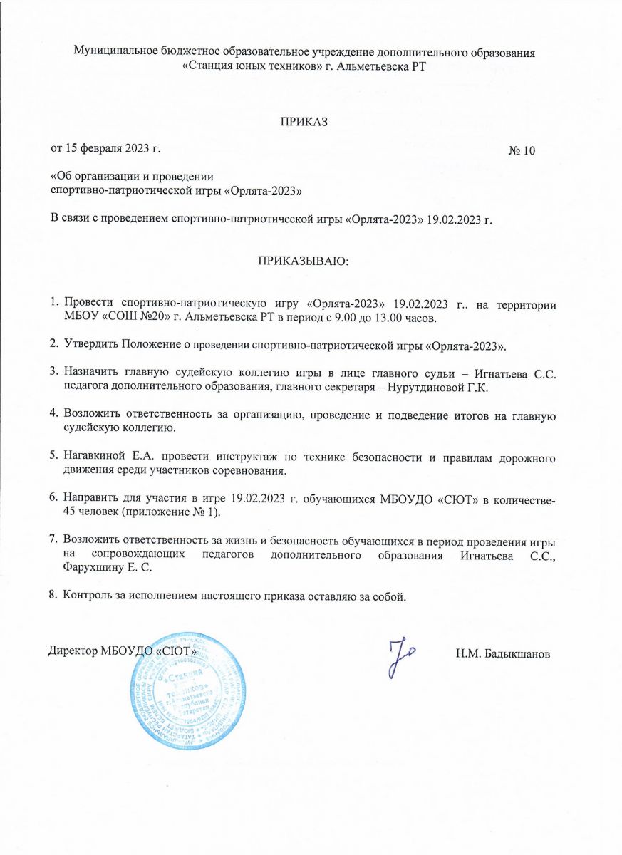 Приказ об организации и проведении спортивно-патриотической игры "Орлята-2024"