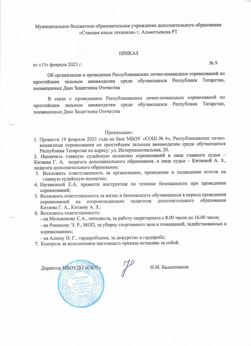 Приказ об итогах республиканских лично-командных соревнований по простейшим зальным авиамоделям