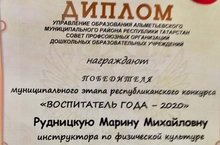 Вот и завершился муниципальный этап Республиканского конкурса "Воспитатель года - 2020" среди педагогов дошкольнхых учреждений АМР. Конкурс проводится ежегодно Управлением образования АМР совместно с Советом профсоюзных организаций дошкольных образовательных учреждений в целях выявления и поддержки инновационных методов, развития творческой инициативы педагогических работников, повышения их профессианального мастерства. В этом году на звание лучшего воспитателя г.Альметьевск претендовали 12 педагогов ДОУ, среди которых прняла участие инструктор по физической культуре нашего сада Рудницкая Марина Михаиловна. По итогам трёх этапов конкурса определились 3 педагога, набравших наибольшее количество баллов, среди которых победителем стала Рудницкая Марина Михаиловна. Марине Михаиловне предствоит защищать наш мунципальный район в зональном этапе Республиканского конкурса "Воспитатель года-2020". Желаем удачи и победы!