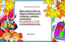 Приглашаем Вас на общее родительское собрание, которое состоится 04 октября в 17:30 в музыкальном зале.