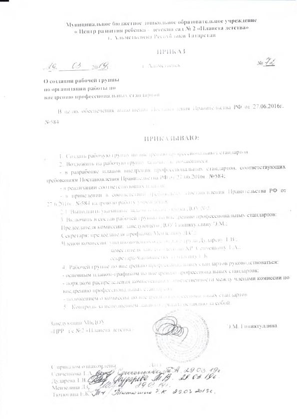 Приказ "О создании рабочей группы по организации работы по внедрению профессиональных стандартов"