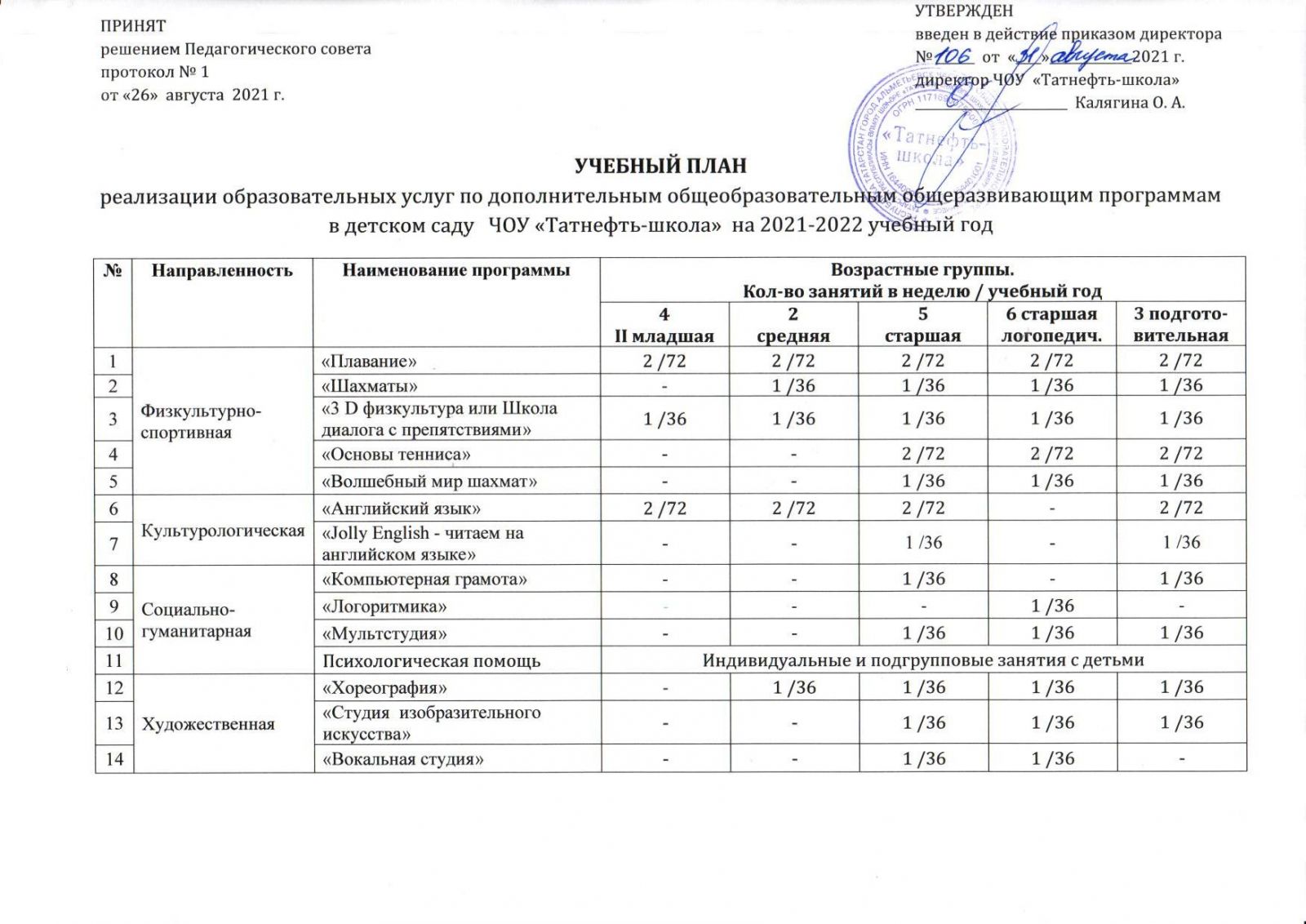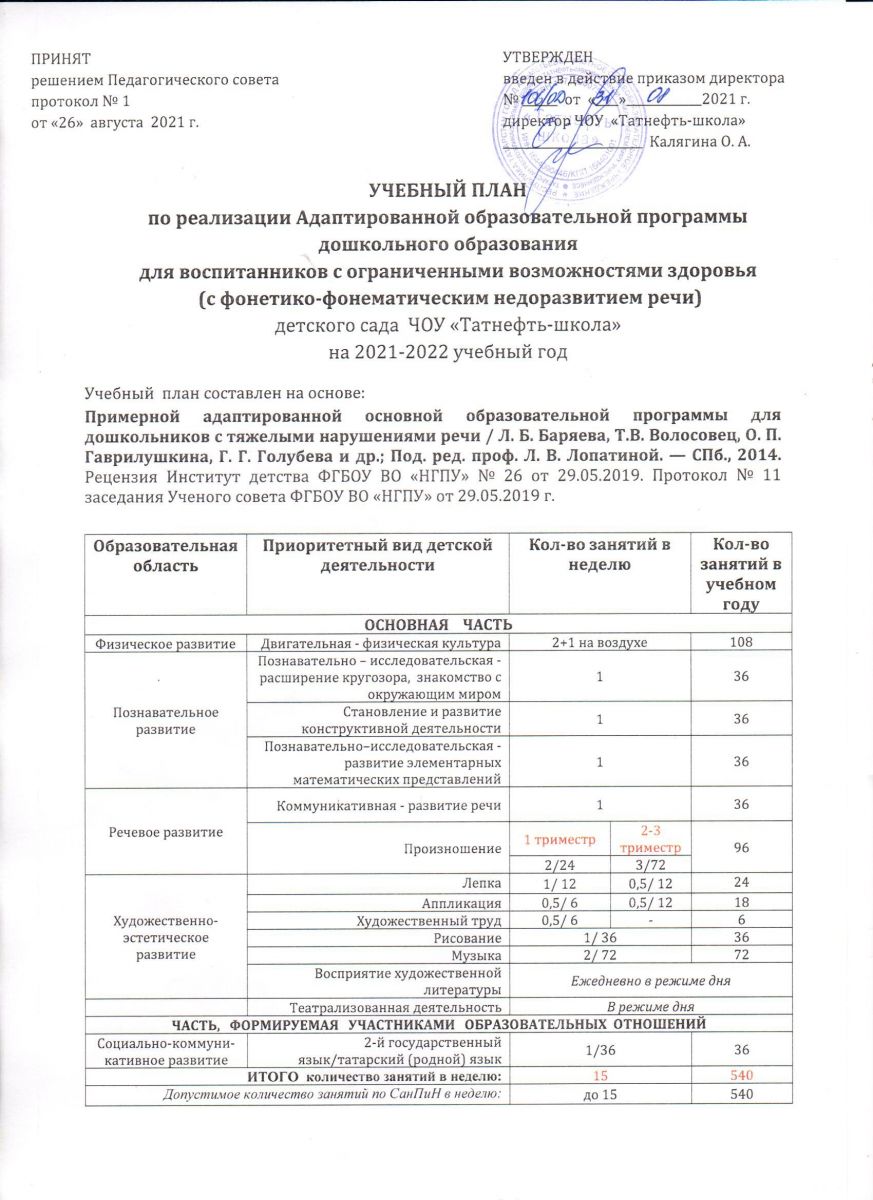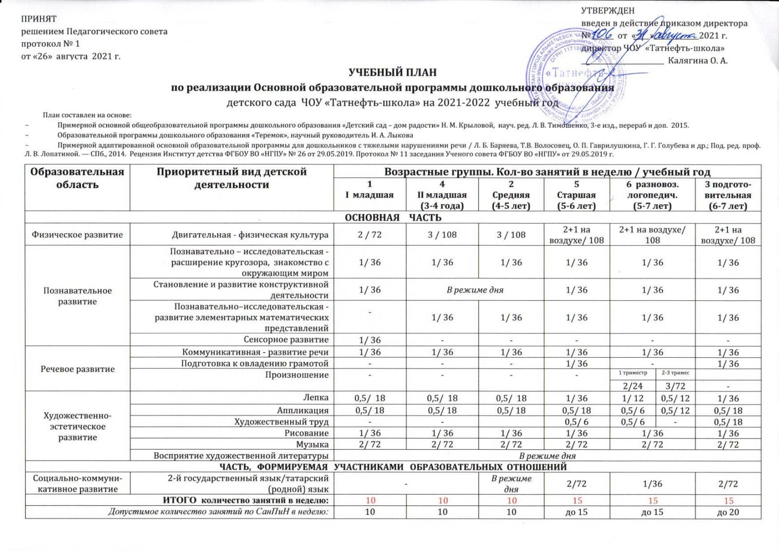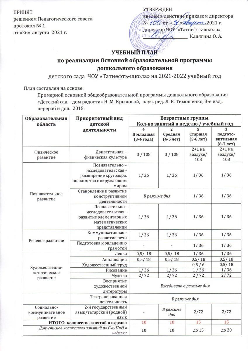 Учебный план по реализации ООП ДО ЧОУ "Татнефть-школа" на 2021-2022 учебный год