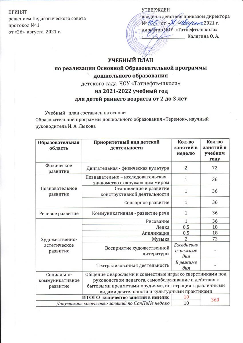 Учебный план по реализации ООП ДО на 2021-2022 учебный год для детей раннего возраста от 2 до 3 лет