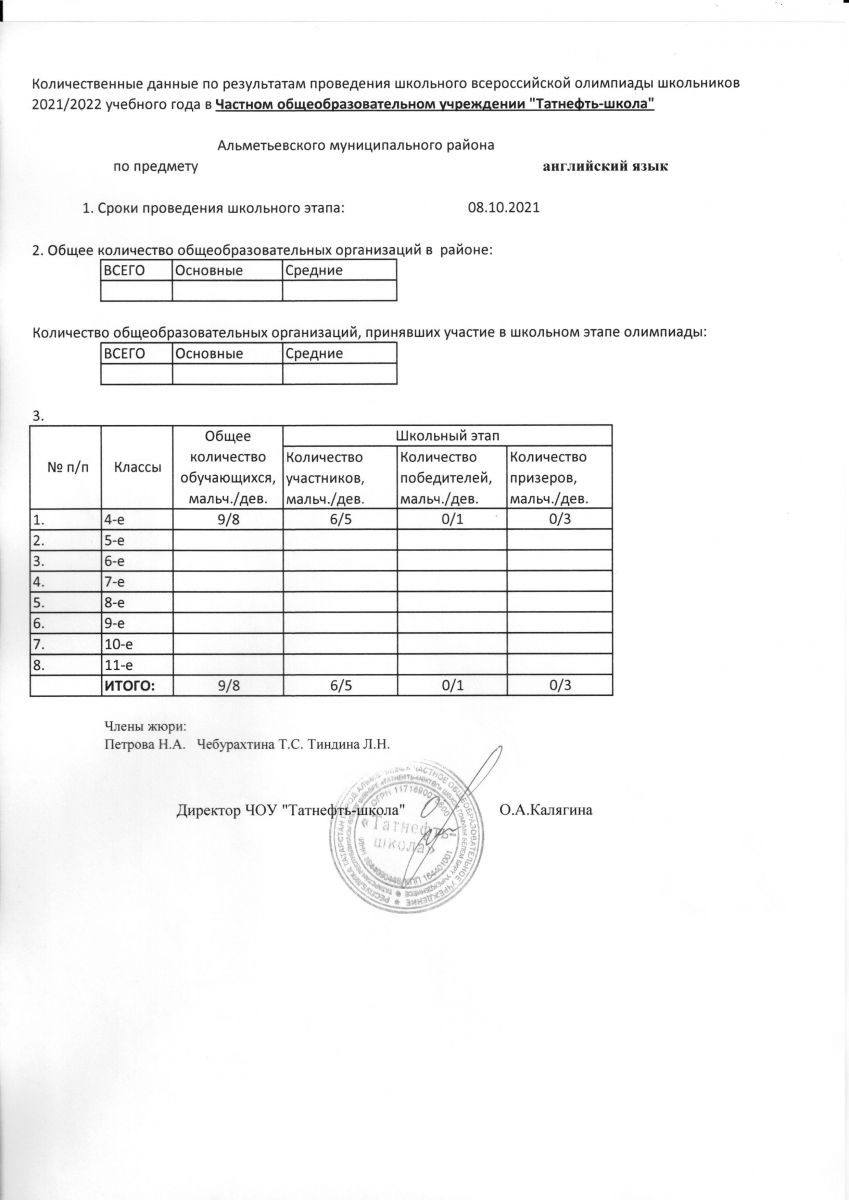 Колличественные данные по результатам проведения школьного этапа Всероссийской олимпиады школьников 2021-2022 учбного года в ЧОУ "Татнефть-школа" по предмету "Английский язык"