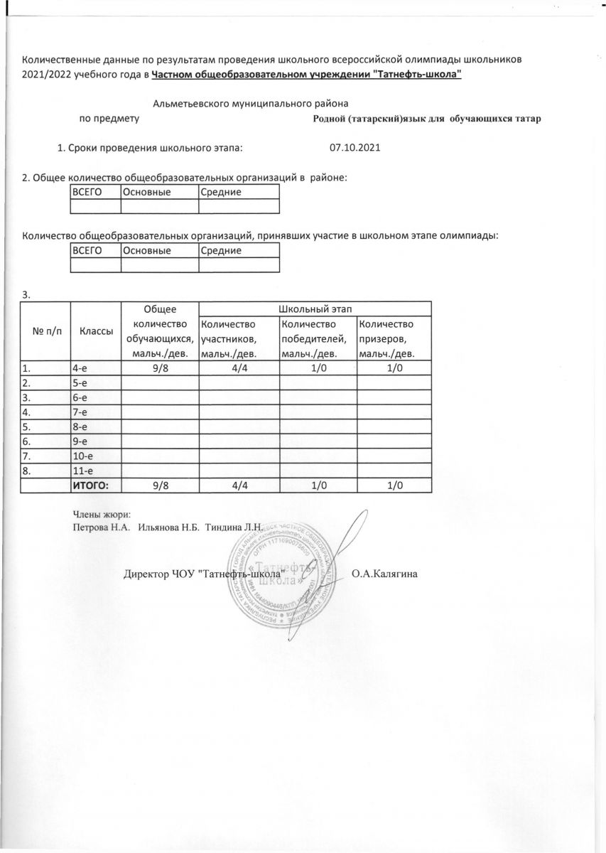 Колличественные данные по результатам проведения школьного этапа всероссийской олимпиады школьников 2021-2022 учбного года в ЧОУ "Татнефть-школа" по предмету "Родной (татарский) язык для обучающихся татар"