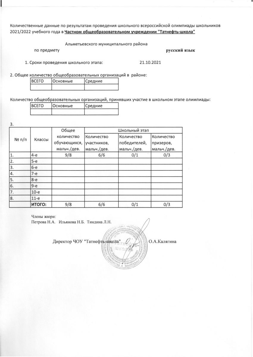 Колличественные данные по результатам проведения школьного этапа всероссийской олимпиады школьников 2021-2022 учбного года в ЧОУ "Татнефть-школа" по предмету "Русский язык"