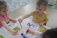 Во второй группе раннего возраста прошло занятие по рисованию на тему:"Весенний дождик". Дети продолжали знакомиться с назначением гуаши и кисточки, учились рисовать с помощью их короткие линии, различали синий цвет.
