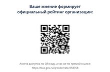 «Вы можете оставить мнение о нашей организации. Чтобы оценить условия осуществления образовательной деятельности наведите камеру Вашего телефона и отсканируйте QR-код. Перейдя по ссылке, Вы сможете: - оценить условия осуществления образовательной деятельности:oб открытость и доступность информации об организации, o комфортность условий осуществления образовательной деятельности, o доброжелательности, вежливости работников, oб удовлетворенности условиями осуществления образовательной деятельности. - оставить отзыв».